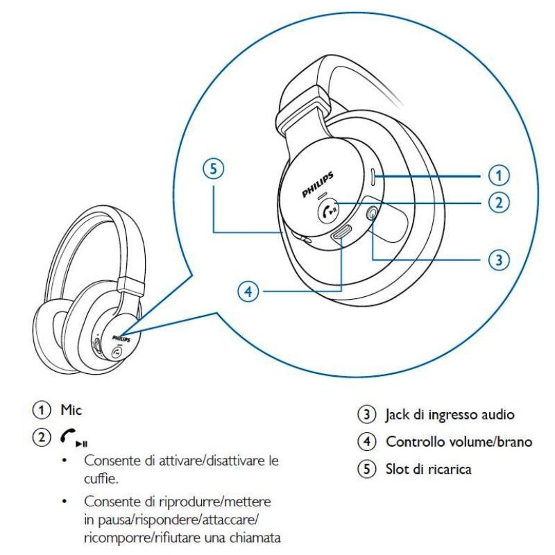 | Funzioni utili | Gestione chiamata: Risposta/Fine chiamata, Rifiuto chiamata, Ricomposizione ultimi numeri, Silenziamento del microfono, Chiamata in attesa, Passa dal telefono al lettore, Controllo del volume. |